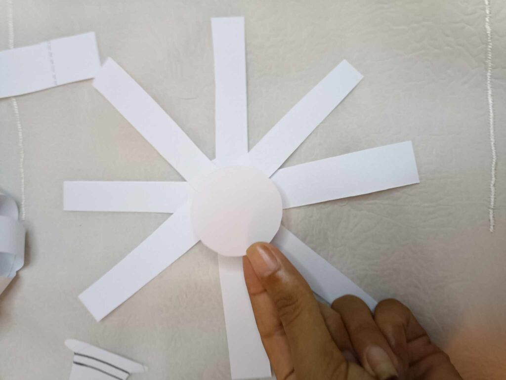 Découpez plusieurs bandes de papier blanc. Coller-les ensemble comme sur la photo pour former le corps. Renforcer le bas du bonhomme avec un rond blanc.