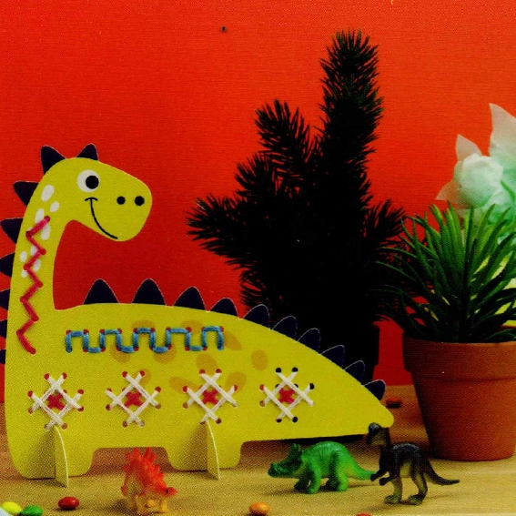 • Contenu du kit : Carton perforé en forme de dinosaure (19,5 x 16 cm), fils colorés, aiguille, et encoches pour faciliter la broderie.
